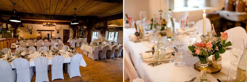Anschließend kann gestaunt, gefeiert und geschlemmt werden, denn auch um das Catering müssen Sie sich keine Sorgen machen: professionelles und freundliches Personal sorgen mit frischen und raffinierten Rezeptideen dafür, dass Sie und Ihre Gäste Ihren Hochzeitstag in angenehmer Erinnerung behalten. Die saisonale Landhausküche lässt keinen Wunsch offen und stimmt sich im Voraus mit Ihren Wünschen ab. Die denkmalgeschützte Scheune des Hofes wurde 2009 mit Liebe zum Detail aufwendig restauriert. Wo ehemals Kühe und Jungvieh standen, werden Sie eingeladen zu speisen. Geprägt von mächtigen Eichenbalken, verleiht der Speisesaal Ihnen eine Hochzeit mit viel Charme und Persönlichkeit. Bis zu 60 Personen finden in der schönen Tenne einen Platz.